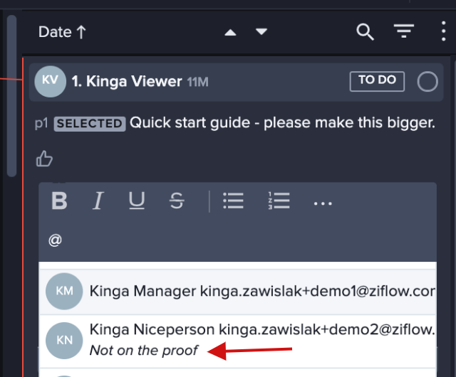 By default, reviewers can only @mention others within their own stage. Your Ziflow administrator can change the permissions to allow the following reviewers to be @mentioned on a proof: